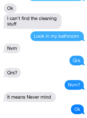 My daughter and I often communicate by text message. Here’s a conversation we exchanged recently when I asked her to do some cleaning in the house while I was out: